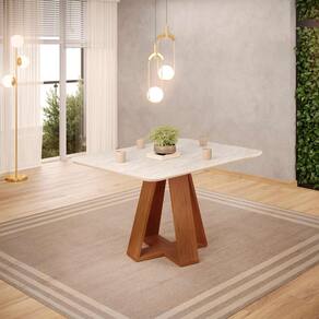 A Mesa Kiara é o que você precisa para decorar a sua sala de jantar, ela possui um design moderno em formato trapézio inclinado e com peças dispostas em formato de cruz, criando um desenho dinâmico e muito elegante. Outro detalhe interessante é que entre as peças principais, existem delicadas peças intermediárias em formato triangular, que proporcionam um diferencial na geometria do produto. Não podemos esquecer que esta mesa ainda te possibilita guardar as cadeiras embaixo do tampo, otimizando o espaço da sua sala de jantar e facilitando a limpeza. O tampo possui vidro pintado aplicado na madeira, aumentando a durabilidade do produto e tornando a limpeza mais fácil e prática. Além disso, os cantos são arredondados, tornando sua sala de estar mais segura. Esta mesa é produzida em MDF e MDP, que são chapas de madeira reconstituída advindas de reflorestamento, matéria prima que não prejudica o ambiente e garante durabilidade e resistência ao seu produto. Para maior durabilidade da mesa, ela possui sapatas deslizadoras que a protegem da umidade, deixando-a levemente afastada do chão. A Mesa Kiara e o Tampo de Madeira Chanfrado com Vidro vão deixar o seu ambiente muito mais sofisticado, acomodando até 4 pessoas, vai receber a sua família e amigos em um ambiente aconchegante e contemporâneo.