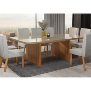 Material: MDF e Vidro | Cor: Naturale e Pérola | Acabamento: Pintura UV | Quantidade do Produto: 1 | Almofada do Assento: Não possui | Marca: Bom Pastor | Quantidade de Lugares: 6 | Formato do Tampo: Retangular | Enchimento do Encosto: Não possui | Enchimento do Assento: Não possui | Possui Suporte Giratório: Não | Possui Vidro: Sim | Possui Rodízio: Não | Material do Tampo: MDF e Vidro | Tipo de Encosto: Não possui | Tipo de Assento: Não possui | Dobrável: Não | Possui Pés: Sim | Pés Reguláveis: Não | Altura: 80 | Largura: 110 | Profundidade: 220 | Modelo: Rimini | Garantia: 3 meses | Quantidade de Caixa de embalagem: 1 | Necessita Montagem: Sim
