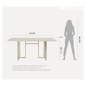 Com estilo industrial e linhas minimalistas, combina facilmente com diferentes estilos de decoração e variados modelos de cadeiras. Produzida com tampo em MDF usinado e vidro pintado colado, é resistente, prática e fácil de limpar. A base em aço carbono com pintura eletrostática garante estabilidade e um acabamento sofisticado, enquanto as sapatas reguláveis proporcionam nivelamento perfeito e proteção para o piso.
