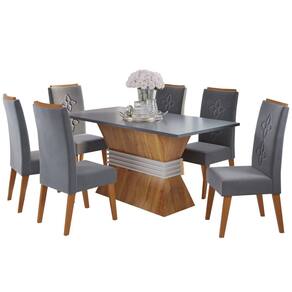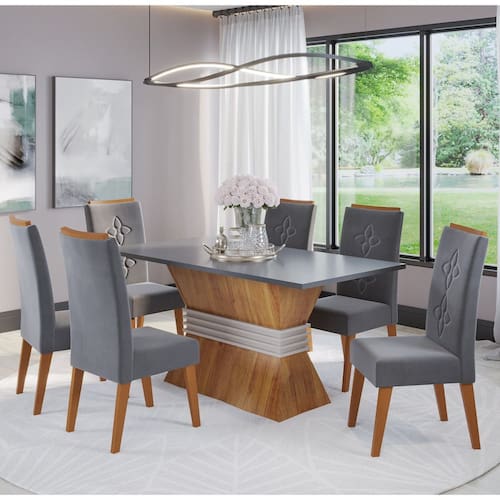 - Categoria: Mesa de Jantar 6 Lugares - Observação: Objetos decorativos que aparecem nas imagens, não acompanham o produto. A capacidade de carga considera que o peso está distribuído igualmente pela peça. As cores das imagens podem variar de acordo com as configurações do seu monitor e/ou da iluminação do ambiente onde o produto está inserido. As imagens indicam uma sugestão - Acompanha: Kit Ferragem e manual de montagem - Possui Tampo?: Sim - Cadeira Estofada: Sim - Possui Puxadores?: Não - Acompanha Cadeiras: Sim - Necessita de Montagem: Sim - Possui Borda de PVC nas Bordas?: Não - Pés com regulagem de altura?: Não - Possui Pés?: Sim - Vidro Temperado: Não - Possui Vidro: Não - Pode Ser Montado Invertido?: Não - Material do Tampo: MDP - Possui Sapatas?: Sim - Possui Rodízios?: Não - Peso Suportado no Tampo: 50 kg - Peso Suportado: 90 kg - Revestimento/Acabamento: Pintura UV - Quantidade de Pés: 24 - Garantia (dias): 90 Dias - Recomendação de Manutenção: Utilizar pano levemente umedecido, seguido de pano seco. Não utilizar quaisquer produtos abrasivos. - Indicação de Uso: Sala de Jantar - Sistema de Montagem: Parafusos, cavilhas, cola e minifix. - Grau de Dificuldade de Montagem: Médio - Como os Móveis Chegarão em Minha Casa?: Desmontado em caixas, acompanhado de todas as peças, ferragens e manuais para montagem. - Quantidade de Sapatas: 28 - Espessura do Tampo (mm): 25 mm - Material do Tampo: MDP - Escala de Brilho: Semi-Brilho - Tecido da Cadeira: VELUDO - Material do Encosto: Mdf, Espuma, Madeira - Medidas da Cadeira ( A x L x P ): A:98,5 x L:41 x P:61cm - Material do Assento: Espuma e Madeira - Altura do Chão até o Assento (cm): 375 - Quantidade de cadeiras por conjunto: 6 - Densidade do Encosto: D-20 - Densidade do Assento: D-20 - Possui Prateleiras?: Não - Quantidade de Lugares: 6 Lugares - Formato da Mesa: Retangular - Possui Espelho?: Não - Possui Portas?: Não - Possui Gavetas?: Não - Espessura da Estrutura: 15 mm, 25 mm, 40 mm - Material da Estrutura: Mdp, Mdf, Eucalipto