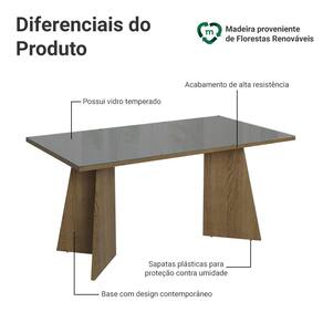 O diferencial está no tampo, que recebe um vidro incolor sobreposto, adicionando sofisticação ao móvel. A mesa conta com uma base em formato trapézio, que combina estabilidade e design moderno. O acabamento de alta resistência da estrutura em tom amadeirado Rustic garante durabilidade e um visual acolhedor e o tampo preto traz um visual elegante.