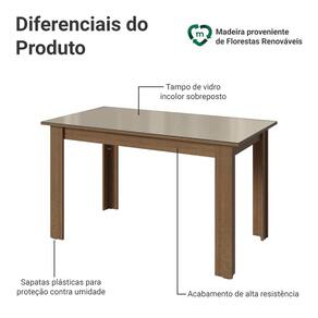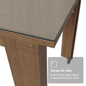 Sua estrutura possui acabamento no tom amadeirado rustic, que traz aconchego e valoriza o ambiente. O tampo no tom crema recebe vidro incolor sobreposto, um detalhe que adiciona sofisticação ao design da mesa e ainda facilita a limpeza no dia a dia, tornando o uso mais prático.