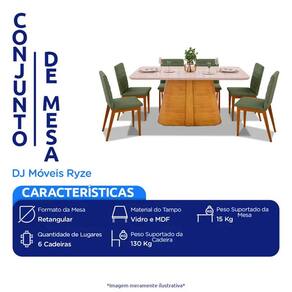 Sua casa nao sera a mesma com o conjunto Ryze! Com ele voce desfruta de um ambiente mais moderno e aconchegante para receber seus convidados da melhor forma possivel, sendo que o conjunto possui capacidade para acomodar ate 6 pessoas de maneira confortavel, gracas a sua base bem projetada e o tampo espacoso com vidro aplicado na madeira, que tambem aumenta a durabilidade do produto e torna a limpeza muito mais facil. Alem disso, os cantos sao arredondados, tornando a sala de jantar muito mais segura.