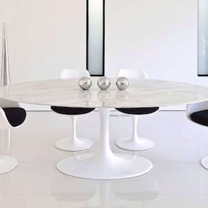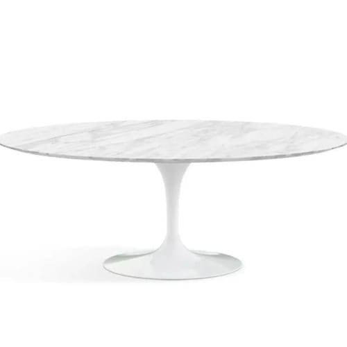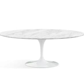 Mesa de jantar Saarinen Oval, Tampo 137x90 cm em Mármore Carrara, com contra tampo em MDF 25 mm, Base em alumínio fundido com pintura automotiva PU.