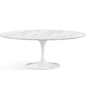 Mesa de jantar Saarinen Oval, Tampo 160x90 cm em Mármore Carrara, com contra tampo em MDF 25 mm, Base em alumínio fundido com pintura automotiva PU.