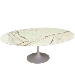 Mesa de Jantar Saarinen Oval, Tampo em Mármore Calacata, com contra tampo em MDF, Base em alumínio fundido com pintura automotiva PU.