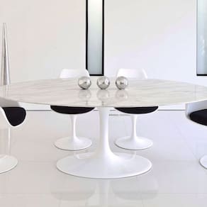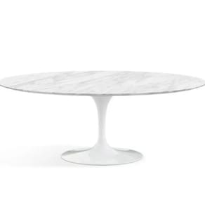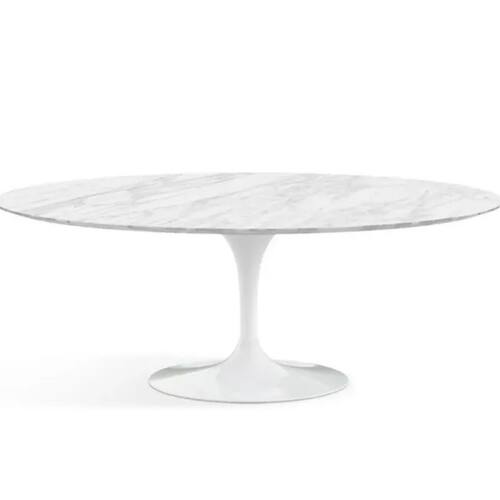 Mesa de jantar Saarinen Oval, Tampo 198x122 cm em Mármore Carrara, com contra tampo em MDF 25 mm, Base em alumínio fundido com pintura automotiva PU.