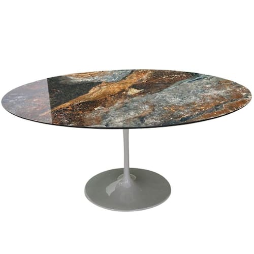 Mesa de Jantar Saarinen Oval, Tampo em Mdf Calacato Estelar, com contra tampo em MDF, Base em alumínio fundido com pintura automotiva PU.