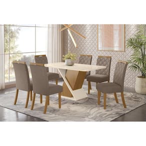 Mesa de Jantar 06 Lugares Solus 1.600 mm Tampo retangular em MDF 25 mm com sobreposição de vidro 4 mm, que garante mais resistência e durabilidade à peça. Tampo canto arredondado com vidro. Cadeira Bella: Densidade da espuma do Assento: D18. Densidade da espuma do Encosto: D15. Medidas; Mesa: A: 800 x L: 1600 x P: 900 mm Cadeira: A: 1005 x L: 430 x P: 560 mm Grantia: 90 dias. Recomendação de limpeza: Usa pano levemente umedecido com água, seguido por pano seco. Evitar exposição ao sol, para aumentar a durabilidade da cor do tecido. Não usar escova e/ou produtos abrasivos. Montagem: Montagem, desmontagem e outras instalações serão de responsabilidade do cliente. Não nos responsabilizamos, no ato da entrega, por subir escadas/elevadores ou pelo transporte por guincho em apartamentos. Eventuais despesas são de responsabilidade do comprador; Observações importantes: A tonalidade da cor do produto pode variar de acordo com a sua tela, a iluminação do ambiente ou sua percepção visual Lembrando que são fotos ilustrativas tratadas em estúdios podendo haver pequena diferença nas cores A montagem será de responsabilidade do comprador; Não nos responsabilizamos, no ato da entrega, por subir escadas/elevadores ou transporte por guincho em apartamentos. Eventuais despesas são de responsabilidade do comprador; Confira as dimensões deste produto e certifique-se de que passará normalmente por supostos elevadores, portas, escadas e/ou corredores de sua residência; Para mais informações, acesse nossa Central de Atendimento. Marca: LM DECOR