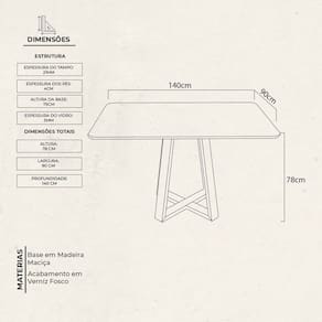 Off White Acabamento: Verniz Acabamento da Base: Verniz Acabamento do Tampo: PU Ambiente Principal: Sala de Jantar Atóxico: Sim codigo_ean: 7900288196392 Complexidade da Montagem: Baixa: pode ser montado por uma pessoa sozinha Cor: Off White Cor do Produto: Off White Design da Base: Em H Dobrável: Não Escala de Brilho: Fosco Espessura do Tampo: 21 mm Extensível: Não Itens Inclusos: 1 Mesa e Kit Ferragens Linha ou Coleção: Estrelar Manual de Montagem e Instalação: https://product-hub-prd.madeiramadeira.com.br/680315292/documents/71cf9d69-403c-425b-a9b0-f9b711fbb1a03071727491417526046220572.pdf Marca: Árvore de Minas Material da Base: Madeira Maciça Material do Tampo: MDF Material Principal: Madeira Maciça Medida da Mesa (A x L x P): 78 x 90 x 140 Medida do Tampo (L x C x E): 90 x 140 x 2,1 Necessita Montagem: Sim Origem do Produto: Nacional Peso: 33,15 kg Possui Portas: Não Possui prateleira: Não Possui Rodízio: Não Possui Suporte Giratório: Não Possui Vidro: Sim Recomendações de Uso, Manutenção e Limpeza: Utilizar pano umido, não utilizar liquidos abrasivos Sistema de Montagem: Fixação de Parafusos Suporta Até (kg): 140 kg Tipo de Madeira Maciça: Tauari Tipo de Madeira Maciça da Base: Tauari
