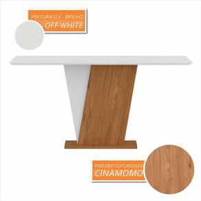 - Material da Base: MDP 15/25mm - Material do Tampo: MDF 25mm - Acabamento: Pintura UV Texturizada/UV Brilho - Tonalidade da Mesa: Cinamomo/Off White - NÃO possui tampo de vidro - NÃO possui cadeiras