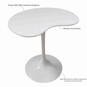 Medidas: Altura 75cm | Tampo 90cm (formato orgânico)Base: Epóxi com pintura automotiva em laca BrancaTampo: MDF 18mm com acabamento Pintura Laca Branca e bordas chanfradas