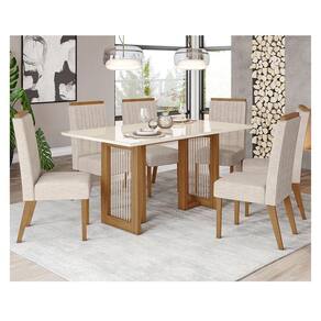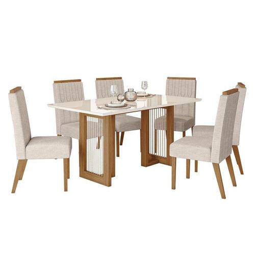 Mesa de Jantar Yara 160 cm Canto Reto com Vidro Off White Cadeira Lavínia Nature Linho – Henn