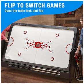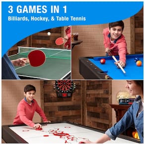 Esta mesa de jogos combina três opções populares em um único espaço compacto, ideal para diversão em família e com amigos. Ela oferece bilhar completo, incluindo tacos de sinuca e bolas para uma experiência autêntica. Além disso, transforma-se facilmente em uma mesa de Air Hockey, equipada com discos de hóquei e empurradores para partidas dinâmicas e emocionantes. Para aqueles que preferem um jogo de pingue-pongue, a mesa converte-se rapidamente com raquetes e uma rede inclusas.