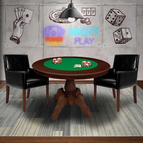 Mesa de Jogos Carteado Redonda Montreal Tampo Reversível Imbuia com 2 Cadeiras Liverpool PU Preto Liso - Gran Belo confeccionada em madeira maciça de jequitibá de forma artesanal, com compensado e MDF laminado. Possui pintura exclusiva com fundo e verniz, além de detalhes da própria madeira que proporcionam ao produto uma beleza única. Contém gavetas com puxadores em madeira e tampo reversível, possibilitando seu uso tanto para jogar cartas de baralho como para mesa de jantar, conseguindo agregar elegância e praticidade ao ambiente.