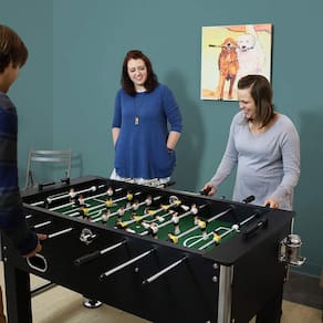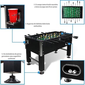 A mesa é feita de MDF laminado de PVC, as hastes são de aço cromado, os jogadores são de plástico ABS e os porta-bebidas dobráveis também são de plástico Inclui: 2 bolas, 4 niveladores de pernas para jogos de mesa justos, jogadores, unidades de pontuação de ábaco, retornos de bolas laterais e suportes para bebidas, para que você tenha tudo o que precisa para um jogo divertido para a família. A unidade de futebol de mesa é preta com detalhes cromados, por isso certamente combina com qualquer ambiente contemporâneo.