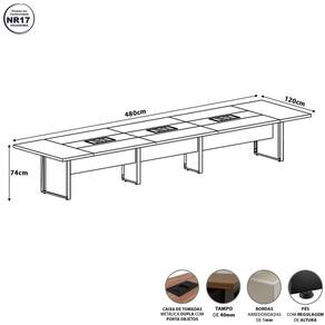 A Mesa de Reunião F5 Office 4,80m é ideal para ambientes corporativos, comporta até 8 pessoas e conta com três caixas de tomadas embutidas e porta objetos centrais. Com pedestal metálico robusto e design sofisticado, combina funcionalidade e elegância para salas de reunião e escritórios executivos.