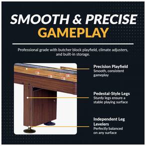 A mesa de shuffleboard Hathaway Challenger é projetada para uso recreativo em casa ou salas de jogos familiares, permitindo partidas para 2 a 4 jogadores adultos com discos azuis e vermelhos. O campo de jogo possui bloco de açougueiro em madeira maciça de 3,8 cm de espessura, unido por dedos e revestido com poliuretano para deslize suave dos discos. Mede 427 cm de comprimento por 61,6 cm de largura e 77,5 cm de altura, com gabinete em MDF laminado nogueira, bisagras de bronze antigo e cantos reforçados em compensado.