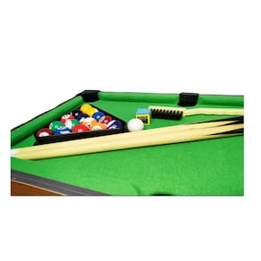 Contém: 1 - mesa de sinuca. 1 - triangulo. 1 - giz. 1 - bola branca. 1 - escova para limpeza. 2 - tacos. 15 - bolas coloridas e numeradas.