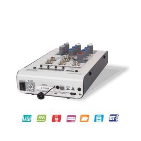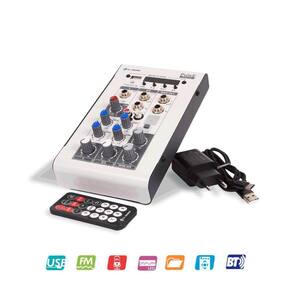 Especificações Técnicas: - Ajuste de Ganho por canal - Media Player com Gravação direta via USB - Bluetooth, PC Direct - Volume independente das saídas L e R - Equalizador de 02 vias: Graves e Agudos - Canal Estéreo com conectores P10 e RCA - Acompanha Fonte Externa com cabo USB - Entrada: 100V-240V - 50/60HZ 0,35A - Compatível com fonte de celulares acima de 10W Permite alimentação por porta USB acima de 2A - Quantidade de canais: 3 Canais P10 - 1 canal mono, 1 estéreo - Alimentação: 90V a 240V - Consumo: 350 mA - Dimensões: Altura de 6,5 cm x Largura de 25,4 cm x Profundidade 15 cm, embalado - Peso: 0,62 Kg - Garantia: 12 meses - Prazo de validade do mixer: Indeterminado Homologação Anatel: 060792000160 Ean: 7898623886261