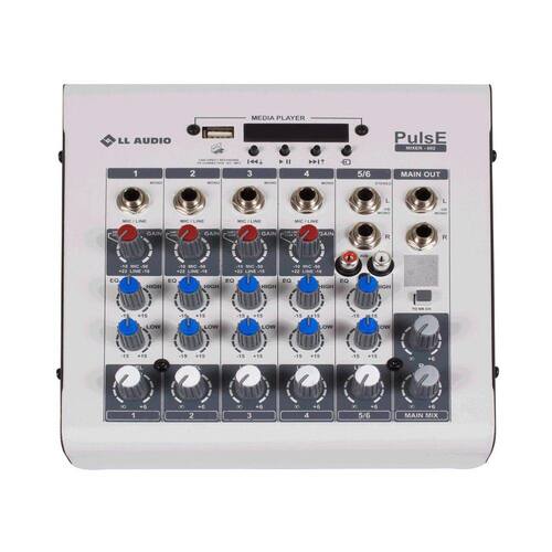 Mesa de som mixer da linha Pulse da LL audio Pulse 602 com 6 canais e Média Player.- Produto 100% nacional- Revenda autorizada LL AudioMP3 Player:- Gravação direta no Pen Drive- Compatível com tecnologia Bluetooth- Volume independente das saídas L e RCaracterísticas:Mesa de uso múltiplo que podem ser utilizadas na produção de músicas residencial, em igrejas, shows ao vivo e outras aplicações.Tamanho e peso reduzidos.Compatível com carregadores de celulares acima de 100W.Pode ser alimentada diretamente por qualquer porta USB de computadores ou por energia móvel Power Pack.Conexão PCSound reproduz o som do comutador diretamente em sua saída se ligado em uma porta USB.Permite a transmissão ao vivo de todo conteúdo de áudio para o computador via USB ou a gravação em Pendrive.Acompanha Fonte Externa com cabo USB e Controle Remoto.Especificações Técnicas:- Ajuste de Ganho por canal- Media Player com Gravação direta via USB- Bluetooth, PC Direct- Volume independente das saídas L e R- Equalizador de 02 vias: Graves e Agudos- Canal Estéreo com conectores P10 e RCA- Acompanha Fonte Externa com cabo USB- Entrada: 100V-240V - 50/60HZ 0,35A- Compatível com fonte de celulares acima de 10W Permite alimentação por porta USB acima de 2A- Quantidade de canais: 6 Canais P10 - 4 canal mono, 1 estéreo- Alimentação: 90V a 240V- Consumo: 430 mA- Dimensões: Altura de 6,5 cm x Largura de 25,4 cm x Profundidade 15 cm, embalado- Peso: 0,95 Kg- Garantia: 12 meses- Prazo de validade do mixer: Indeterminado