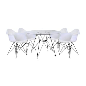 Mesa De Vidro Redonda Eames Eiffel 90cm Com 4 Poltronas Brancas Ferro Preto O Conjunto de Mesa Eames Eiffel e Poltrona Daw se destaca pelo design moderno e sofisticado. Com base em ferro que confere total resistência, garantindo melhor durabilidade, sendo uma ótima escolha para quem busca conforto e design único.Tipo: ConjuntoModelo: DawCor do Tampo: VidroCor do Assento: BrancoCARACTERÍSTICASAssento: PolipropilenoTampo: VidroBase: FerroGarantia: 90 DiasDIMENSÕES DA POLTRONAAltura: 80cmAssento até o chão: 40cmBraço do assento até o chão: 65cmLargura: 38cmComprimento: 38cmSuporta até: 120kgDIMENSÕES DA MESAAltura: 76cmDiâmetro: 90cmRECOMENDAÇÕESLimpeza: Utilize um pano macio levemente úmido.Necessita montagem.ATENÇÃOAS IMAGENS SÃO MERAMENTE ILUSTRATIVAS E PODEM SOFRER VARIAÇÕES DE COR E PEQUENOS DETALHES DE ACORDO COM O SEU MONITOR, ILUMINAÇÃO DO AMBIENTE E ATÉ MESMO A SUA PERCEPÇÃO VISUAL.