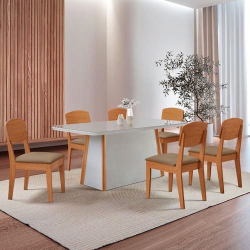 A cadeira Copper, com encosto em MDF e Assento Estofado, oferece Conforto e suporte ideais. O conjunto e uma escolha que agrega sofisticacao e praticidade a qualquer ambiente.