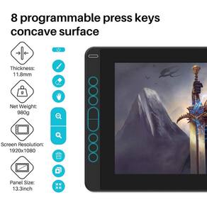 ESPECIFICAÇÕES TÉCNICAS Marca: Huion Modelo: GS1331G Cor: Verde Cosmo Resolução da Tela: Full HD 1920 x 1080 16:9 Sistema Operacional: Windows 7 ou superior / MACOS 10.12 ou superior / Android 6.0 ou superior Teclas: 8 Tela: Full HD Taxa de Relatório: 266 PPS Níveis de pressão: 8.192 níveis Tecnologia da Caneta: Sem bateria EMR passivo Caneta: PW517 Area de trabalho: 293.76 x 165.24 mm Altura de detecção: 10 mm Controle de inclinação: 60graus Resolução da Caneta: 5080 LPI Precisão: 0.5 mm Centro 3 mm Canto Tensão de Entrada: AC 100-240V. 50/60Hz Conteúdo da Embalagem: Kamvas 13 Cabo 3 em 1 Cabo de extensão USB Adaptador de alimentação Caneta PW517 Pontas de caneta PN05A x10 Clipe de ponta de caneta Suporte de caneta PH05A Luva artística GL200 Pano de limpeza Guia de início rápido Dimensões do Produto (AxLxP): 11.8 x 21.7 x 36.6 cm Dimensões da Embalagem (AxLxP): 18.0 x 28.0 x 42.0 cm Peso Líquido: 4.0 Kg Peso Bruto: 5.0 Kg Garantia: 12 Meses