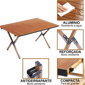 Leve, compacta e cheia de estilo! Essa mesa dobrável retrátil é feita em alumínio resistente com acabamento tipo madeira imbuia, unindo durabilidade e elegância.
