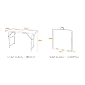 AMesa Dobrável Cuscoé perfeita para ser transportada e armazenada sem ocupar espaço, pois quando se fecha se torna uma maleta. Seu material é de fácil limpeza e durabilidade, podendo ser usada em ambientes externos. Seu tampo é em polietileno de alta densidade e base em aço carbono com pintura em pó.
