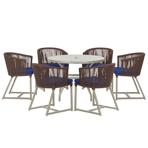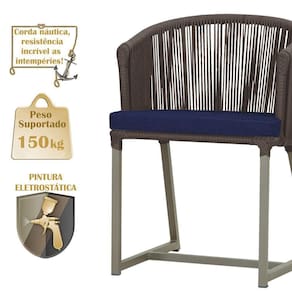 Combinando estilo e resistencia, esta Mesa e cadeiras traz o melhor do design contemporaneo em aluminio com micro pintura e acabamento em corda nautica. O Estofado impermeavel completa o conforto e a funcionalidade, tornando-a ideal para ambientes externos e internos.