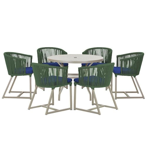 Combinando estilo e resistencia, esta Mesa e cadeiras traz o melhor do design contemporaneo em aluminio com micro pintura e acabamento em corda nautica. O Estofado impermeavel completa o conforto e a funcionalidade, tornando-a ideal para ambientes externos e internos.