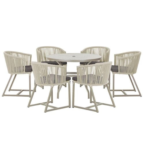 Combinando estilo e resistencia, esta Mesa e cadeiras traz o melhor do design contemporaneo em aluminio com micro pintura e acabamento em corda nautica. O Estofado impermeavel completa o conforto e a funcionalidade, tornando-a ideal para ambientes externos e internos.