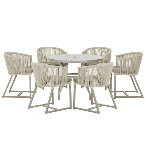 Combinando estilo e resistencia, esta Mesa e cadeiras traz o melhor do design contemporaneo em aluminio com micro pintura e acabamento em corda nautica. O Estofado impermeavel completa o conforto e a funcionalidade, tornando-a ideal para ambientes externos e internos.