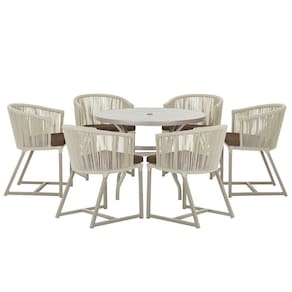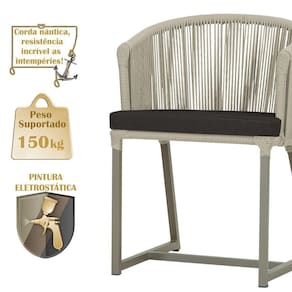 Combinando estilo e resistencia, esta Mesa e cadeiras traz o melhor do design contemporaneo em aluminio com micro pintura e acabamento em corda nautica. O Estofado impermeavel completa o conforto e a funcionalidade, tornando-a ideal para ambientes externos e internos.