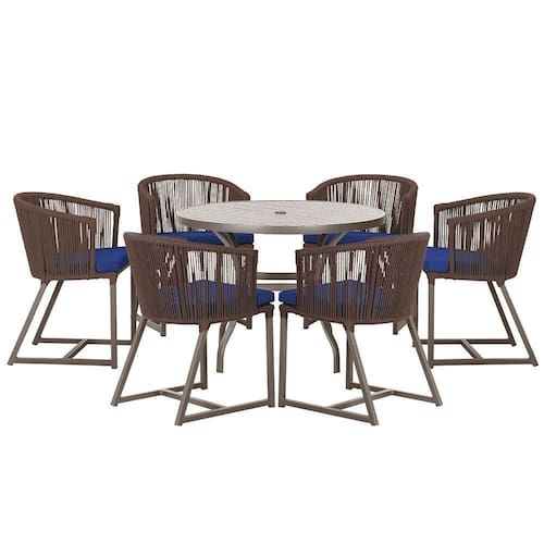 Combinando estilo e resistencia, esta Mesa e cadeiras traz o melhor do design contemporaneo em aluminio com micro pintura e acabamento em corda nautica. O Estofado impermeavel completa o conforto e a funcionalidade, tornando-a ideal para ambientes externos e internos.