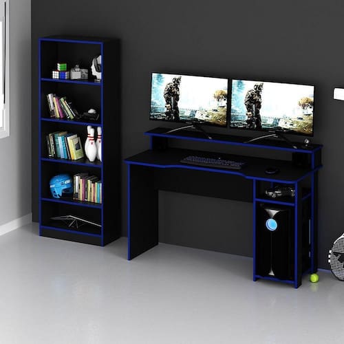 Conjunto Mesa e Armário para Escritório Home Office GamerCool MDP Preto/Azul - Gran Belo A Mesa possui usinagem anatómica no tampo para melhor conforto, prateleira auxiliar, nicho aberto para ventilação da CPU e espaço para até dois monitores. O Armário possui cinco prateleiras com espaço para armazenar diversos itens e objetos.Criatividade, qualidade e modernidade são as principais características desse conjunto, sua proposta é ousada sendo pratica para diversas horas de . Para montar o seu home office ou espaço gamer com estilo essas são as peças ideais. Aproveite, garanta já o seu!
