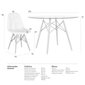 CADEIRAS: Material do assento: Couro PU - Material da base: Madeira e aço - Altura do assento: 45 cm - Largura do assento: 44 cm - Profundidade do assento: 38 cm - Distância entre os pés: 40 cm - Peso suportado: 130 kg. MESA: Material do tampo: Vidro incolor temperado 8 mm - Material da base: Madeira e aço - Altura: 75 cm - Diâmetro: 120 cm - Garantia: 3 meses.
