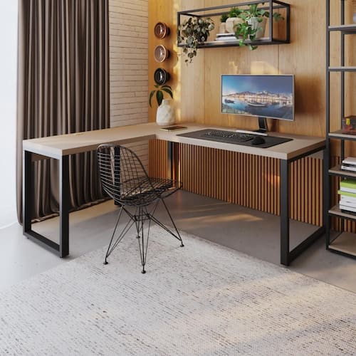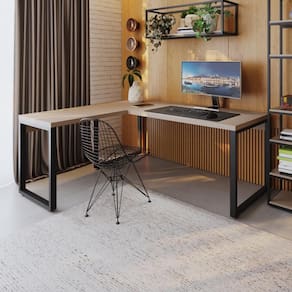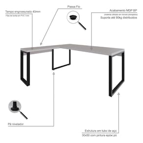 A mesa em L Yon YOML7190 possui dimensões generosas, combinando funcionalidade com o design industrial, ideal para criar uma estação de trabalho eficiente e estilosa. O tampo desta mesa é engrossurado em 40mm e as bordas possuem acabamento em fita de PVC de 01mm, proporcionando durabilidade e uma superfície muito resistente. Os pés são feitos em tubos de aço 30x50mm, conferindo estabilidade, robustez e uma imponente qualidade. Sua combinação de materiais e proporções bem pensadas a tornam uma opção de escolha versátil e elegante para ambientes corporativos ou home offices.