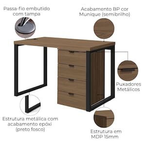 Mesa para Escritório com Gaveteiro Frame, ideal para ambientes que exigem praticidade, organização no estilo industrial. Estrutura 100% MDP (tampo mesa 40mm/ gaveteiro 15 mm) com acabamento em pintura BP, pés metálicos (pintura epóxi fosco) e sapatas niveladoras. Mesa equipada com passa fios com tampa embutida, e gaveteiro composto por 4 gavetas com corrediças telescópicas. Estes produtos serão entregue em 03 volumes.