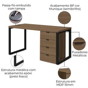 Mesa para Escritório com Gaveteiro Frame, ideal para ambientes que exigem praticidade, organização no estilo industrial. Estrutura 100% MDP (tampo mesa 40mm/ gaveteiro 15 mm) com acabamento em pintura BP, pés metálicos (pintura epóxi fosco) e sapatas niveladoras. Mesa equipada com passa fios com tampa embutida, e gaveteiro composto por 4 gavetas com corrediças telescópicas e puxadores em alumínio. Estes produtos serão entregue em 03 volumes.