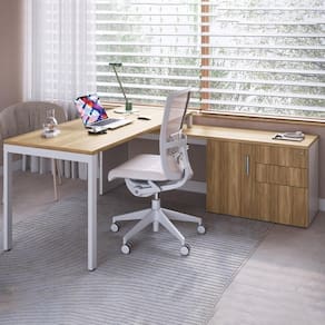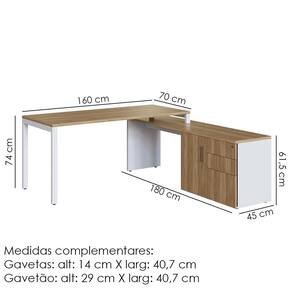 Conjunto de Mesa e Balcão Concept para Escritório alia funcionalidade e organização para ambientes de trabalho. Estrutura em MDP 15 mm (tampo da mesa 25 mm) com acabamento em pintura BP. Possui porta com dobradiça metálica, 3 gavetas (uma com trava por chave e um gavetão para pasta suspensa), base metálica em aço carbono e sapatas reguláveis com travessa antiempenamento. O balcão flex permite montagem à direita ou esquerda, conforme preferência. Entregue em 3 volumes.