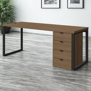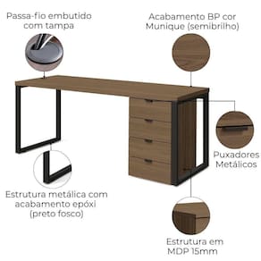 Mesa para Escritório com Gaveteiro Frame, ideal para ambientes que exigem praticidade, organização e estilo industrial. Estrutura 100% em MDP, sendo tampo da mesa com 40 mm e gaveteiro com 15 mm, ambos com acabamento em pintura BP (semibrilho). Possui pés metálicos com pintura epóxi fosca e sapatas niveladoras. A mesa é equipada com passa-fios com tampa embutida, e o gaveteiro conta com 4 gavetas com corrediças telescópicas e puxadores em alumínio. Estes produtos serão entregues em 03 volumes.