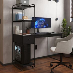 Com prateleiras estratégicas para otimizar o armazenamento e uma gaveta prática para manter seus itens essenciais sempre por perto, esta escrivaninha oferece tudo que você precisa para trabalhar ou estudar com eficiência e conforto.