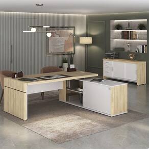 Transforme o seu escritório ou home office em um espaço funcional e organizado com a Mesa Escritório em L e Balcão 2 Portas 3 Gavetas Corp A06 Carvalho/Branco, da Mpozenato.
