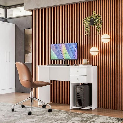 A Mesa Escrivaninha foi desenvolvida pela Qmovi para completar seu escritório ou ambiente de estudo. Possui design compacto e ergonômico, que ajuda na otimização do espaço e promove o conforto necessário para acompanhar os momentos de trabalho e aprendizado. Possui uma prateleira elevada para o CPU e duas gavetas para melhor organizar seus objetos. Aproveite e garanta já a sua!