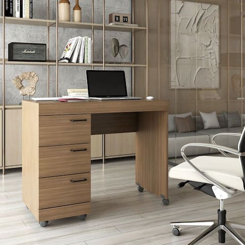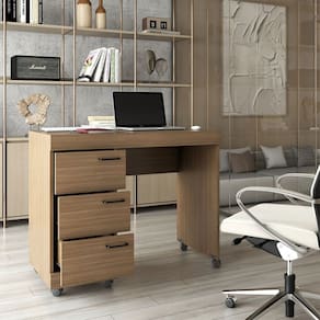 O(a) Mesa Escrivaninha Aspa 3 Gavetas Castanho - Loja é produzido em MDP na escala de brilho Fosco, e possui um grau de dificuldade de montagem: Médio.