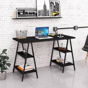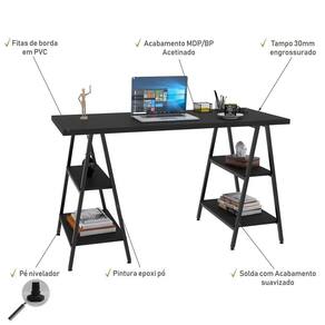 Pensando nisso, a Mpozenato desenvolveu a Mesa Cavalete Prisma para trazer inovação e funcionalidade ao seu dia a dia de trabalho e estudos. Essa mesa de escritório conta com uma estrutura metálica slim, sendo os pés cavaletes confeccionados em Aço, com soldas suavizadas e pintura epóxi na cor Preta, além dos niveladores de altura. Já o tampo engrossurado de 30mm e as prateleiras na cor Preto Ônix são fabricados em MDP com acabamento BP acetinado, proporcionando maior durabilidade e resistência ao produto.