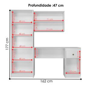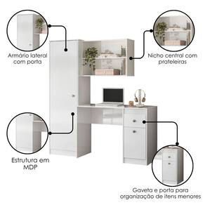 Mesa Escrivaninha Coimbra, organização e praticidade reunidas em um só móvel. Estrutura em MDP de 15 mm com acabamento em pintura UV. Conta com armário lateral com 1 porta e 4 prateleiras internas, além de nicho superior com prateleira, ideal para organização e apoio de itens, e módulo com 1 gaveta equipada com corrediças telescópicas, indicada para objetos menores. Possui puxadores em PVC na cor bronze. Demais itens decorativos não inclusos. Produto entregue em 2 volumes.