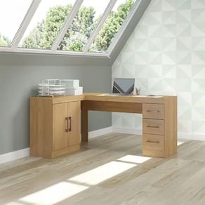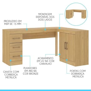 Mesa Escrivaninha Com Armário Gaveteiro Carvalho Menu Móveis Carvalho A Mesa Escrivaninha 3 em 1 e o movel perfeito para deixar o seu home office ainda mais completo. Alem de possuir um tampo em L, ainda dispoe de tres gavetas e um armario com duas portas e uma prateleira interna, otimo para manter tudo organizado e com muito espaco para seus documentos e material. Alem disso, o gaveteiro e armario podem ser montado nos dois lados, se adequando melhor ao seu ambiente. A Mesa e produzido com materiais de excelente qualidade, garantindo a durabilidade e vida util. O melhor em moveis no design atual aliando conforto, qualidade e otimos precos, so na Menu Moveis! Caracteristicas: Referencia: 0714 Material: MDP de 15 mm Acabamento: Pintura UV na cor Carvalho Portas: 02 Gavetas: 03 Prateleiras: 01, interna Portas com Dobradica Metalica Gavetas com Corredica Metalica Puxadores tipo Alca em ABS na cor Bronze